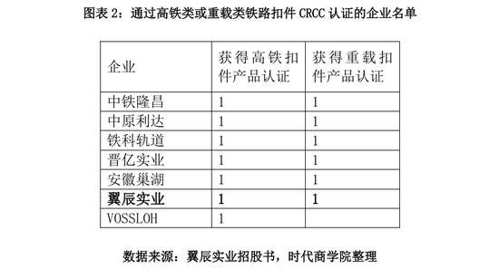 铁路扣件产品分为高铁类、重载类、普轨类、城轨类。高铁类与重载类铁路扣件产品是翼辰实业的优势产品,也是重要盈利来源。在这两个领域获得CRCC认证的企业较少,仅有7家。