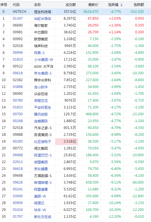 恒生科技指数午后跌幅进一步扩大,目前跌近5%,新东方在线跌超12%,快手、明源云跌超10%,美团跌近10%,阿里健康、B站等跌超9%。