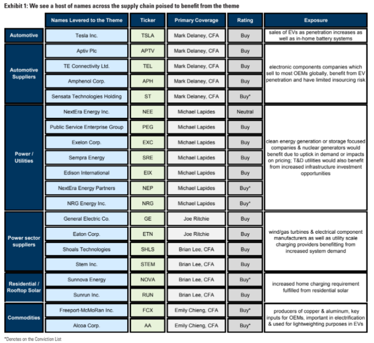 最后,高盛还看好传输和分配电力所需的基础设施。报告写道,电力公司和公用事业公司对输配电(T&D)基础设施的投资需求将大幅增长,特别是对有DC快速充电(DCFC)能力充电基础设施的投资将大幅增长。