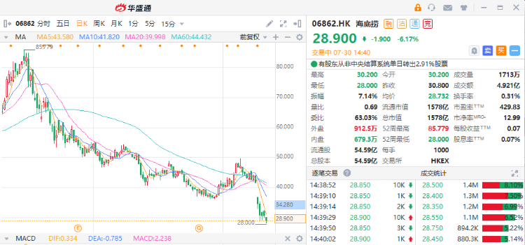 作为港股市值千亿的餐饮巨头,海底捞今日再次刷新了一年以来的新低,一度跌至28港元,较7月15日的高点跌掉约45%,较历史最高点85.78港元更是暴跌了近70%。按照每股85港元计算,海底捞的市值自2月16日累计蒸发了3000亿港元(约2500亿人民币),几乎是跌去了1/3个五粮液。那么如此跌势下,海底捞还会不会继续下行,止跌的信号在哪里,除此之外,机构又给其怎样的预期?
