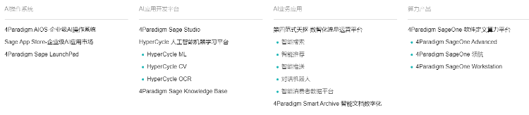 公司产品主要可分为AI操作系统、AI应用开发平台、AI业务应用以及算力产品四大类。在2020年中,第四范式发布了Sage AIOS、Sage HyperCycleML、天枢、SageOne等系列产品,以形成从算力、操作系统、生产平台到业务系统的全栈式AI产品矩阵。