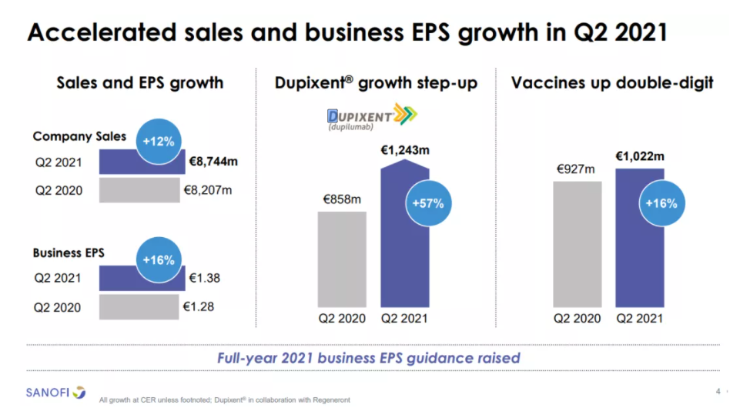 7月29日,赛诺菲公布2021上半年财报数据,营收共计173亿欧元。其中,制药业务收入132亿欧元(+1.4%)、疫苗业务收入19.4亿欧元(+5.5%)、消费者保健业务收入22亿欧元(5.2%)。2季度销售额87.44亿欧元,同比增长12%。特应性皮炎、哮喘治疗重磅药物Dupixent(度普利尤单抗)增长57%,达到12.43亿欧元,上半年销售收入达到22.9亿欧元。
