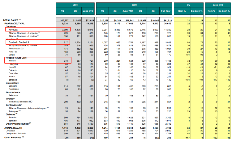 7月29日,默沙东公布2021年上半年业绩,总收入220.29亿美元,同比增长12%。上其中,Keytruda(K药)销售收入80.78亿美元,较去年同期增长23%。另外两款重磅产品Gardasil 9(HPV疫苗)和Bridion(舒更葡糖钠)上半年累计营收21.51亿美元(+23%),其中Q2贡献12亿美元(+88%)。
