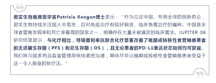 7月29日,君实生物(1877.HK,688180.SH)宣布,国家药品监督管理局(NMPA)已受理公司自主研发的抗PD-1单抗药物特瑞普利单抗联合含铂化疗一线治疗局部晚期或转移性食管鳞癌的新适应症上市申请,这也是特瑞普利单抗在中国递交的第五项上市申请。