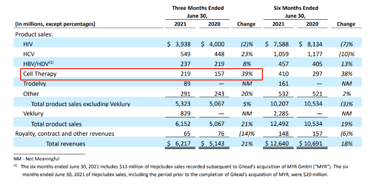 7月29日,吉利德公布最新财报数据,Q2总营收为62.17亿美元,同比增长21%;净利润为15.22亿美元,去年同期亏损33.39亿美元;摊薄后每股收益为1.21美元,去年同期每股亏损2.66美元。与2020年同期相比,2021年第二季度细胞治疗产品销售额增长39%,达到2.19亿美元。