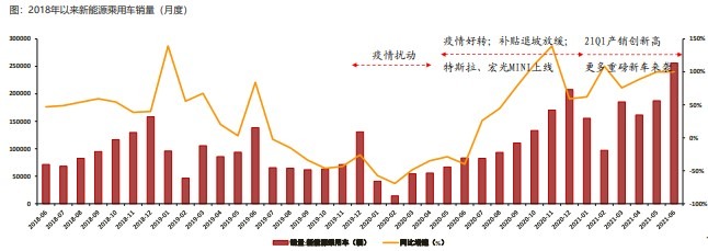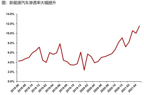 由政策驱动走向市场需求拉动,新能源汽车的渗透率显著提升,仅6个月内,就从2021年1月的占比7.2%提升至6月超过12%。