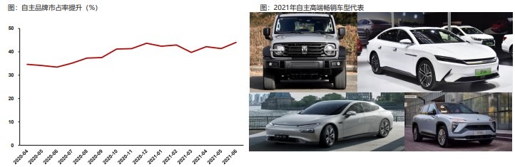 自2020年以来,可以看到一个趋势是自主品牌的崛起,其市占率从33%提升到现在的46%,而自主品牌不断向上突破的原因是坚定新能源和智能化转型,譬如的比亚迪汉、欧拉黑猫、宏光mini,新势力中的小鹏p7、理想one等。