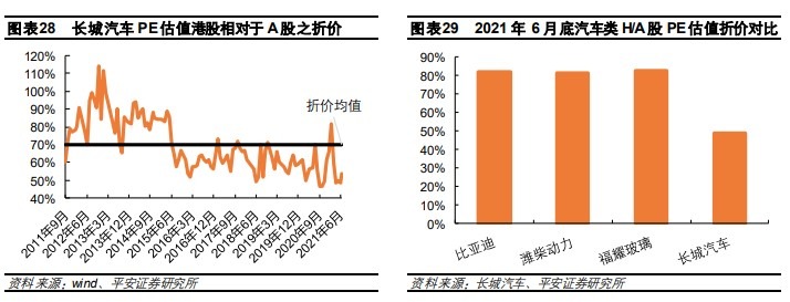 平安证券认为,目前长城汽车H股估值与其A股估值的折价处于历史平均水平以下,折价亦低于其它在两个市场上市的汽车类个股。