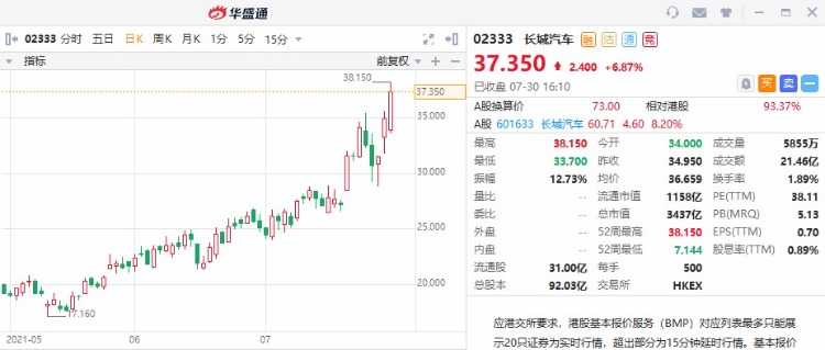 7月30日收盘,长城汽车的股价收涨6.87%,报37.35港元。