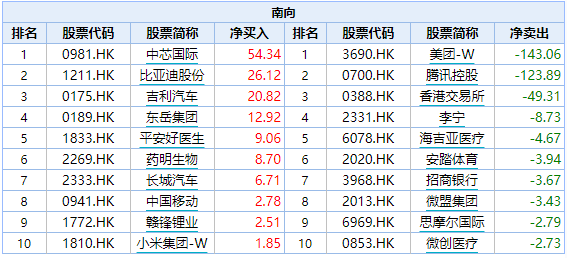 个股资金流向统计:南下资金大买中芯国际、比亚迪股份,大量抛售美团、腾讯