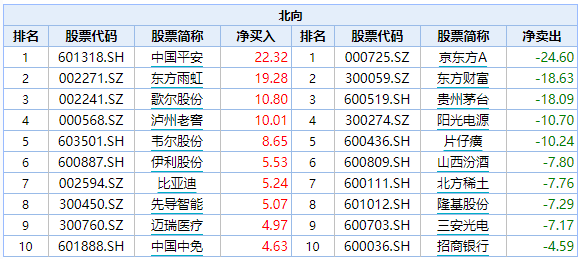 本周北上资金买入金额最多的标的为中国平安,一周净买入22.32亿元。东方雨虹获净买入19.28亿元,歌尔股份获净买入10.80亿元。泸州老窖、比亚迪、迈瑞医疗也获港资加仓。