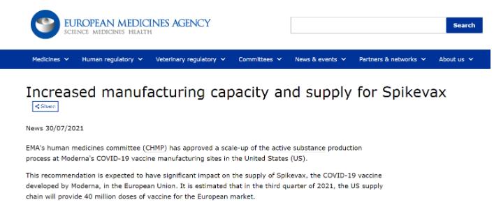 7月30日,欧洲药管局发布公告称,同意莫德纳新冠疫苗有效物质扩大生产,这次的扩大生产主要厂址在美国。通过此次的扩产,莫德纳新冠疫苗对欧洲的供应将在下半年大幅增加。