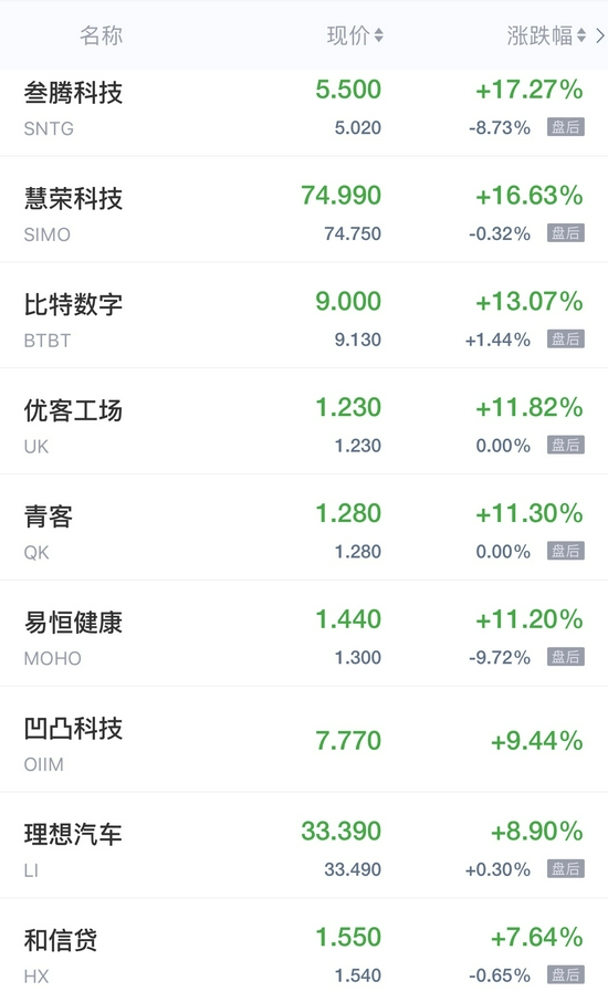 叁腾科技涨超17%,比特数字涨超13%,优客工厂涨近12%,青客涨超11%,猎豹移动、趣头条涨超2%,网易、36氪、微博涨超1%。