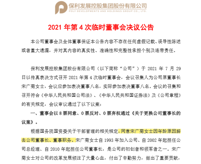 今天,保利发展控股发公告称,公司同意宋广菊女士因年龄原因辞去公司董事长、董事职务,同时,同意选举刘平担任公司董事长。