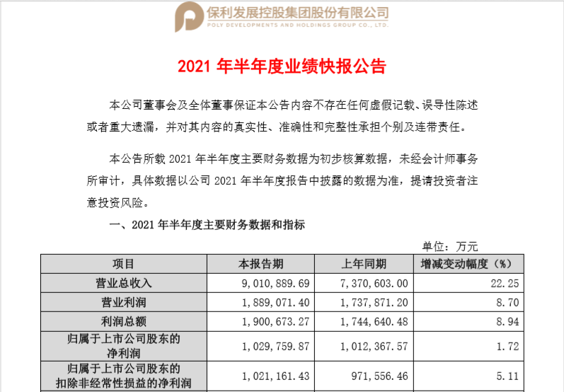 本月,保利发布今年上半年业绩快报。预计上半年实现营收901.09亿元,同比增长22.25%;实现归母净利润同比增长1.72%。