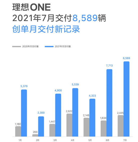 理想汽车7月交付8589辆理想ONE,单月交付量首次超过八千辆,同比2020年7月增长251.3%,环比2021年6月增长11.4%。2021年前七个月,理想汽车总交付量达38743辆。理想ONE目前累计交付量已达72340辆。
