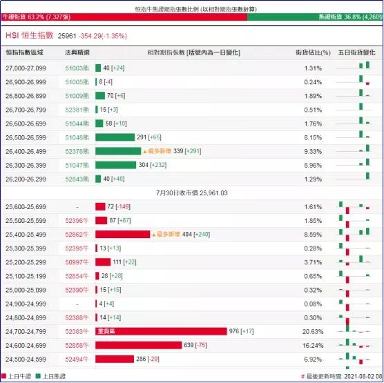 街货分布方面,至上周五,贴价恒指牛证的街货仍相对稀疏,重货区在收回价24500点至24800点之间,相当约1901张期指合约;恒指熊证街货亦分散,在收回价26200点至26600点之间,累计相当约974张期指合约。