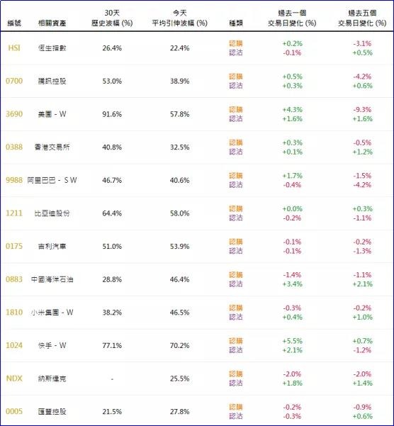 上周五恒指相关权证的平均引伸波幅报约22.4%,按日小幅调升。个股方面,腾讯、美团、港交所、快手等相关权证的引伸波幅均有明显上升,吉利、海油、汇丰等相关认购证的引伸波幅则有所调降。
