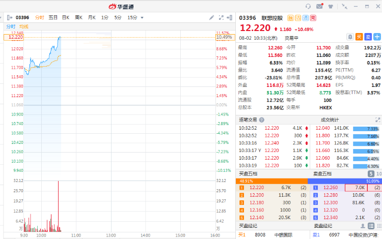 联想控股(3396.HK)大涨10.49%,报12.22港元,最新市值287亿港元。