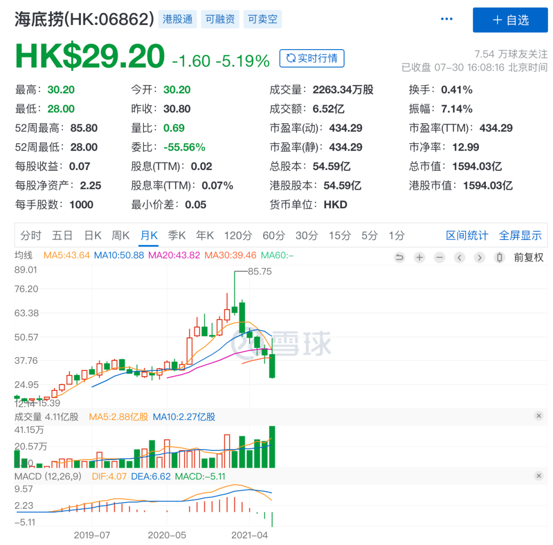 特别是在后疫情的冲击下,海底捞的“中年危机”显现,自今年2月以来,海底捞的股价从85.75港元一路下跌至29港元左右。
