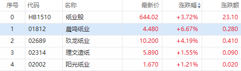 华盛资讯8月2日消息,纸业股今日午后持续走强,截止发稿,晨鸣纸业涨6.67%;玖龙纸业上涨4.19%;理文造纸、阳光造纸涨超1%。