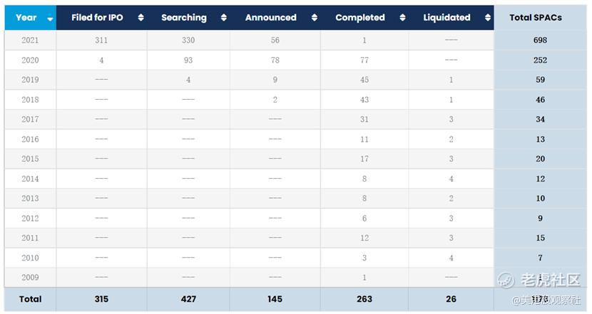 我们知道,由于近两年SPAC火爆,市场上SPAC的数量快速增加。根据SPAC Insider的统计2021年至今有698个SPAC,比2009年至2020年加起来的数量还要多。
