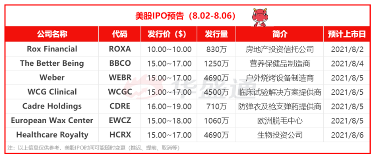 本周预计将有7只新股登场,较此前三周的新股数量下降较多,涉及保健、临床试验及生物投资等多个行业。话不多说,赶紧来看看本周新股都有哪些亮点吧~