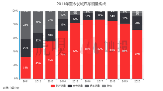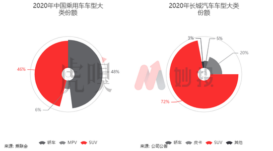 按照车辆类型划分,2020年中国乘用车市场中轿车和SUV“两分天下”,实际份额为48%(轿车)对46%(SUV)。而长城汽车的汽车销售类型明显不同,占比最多达72%的是SUV,甚至连狭义乘用车都不算的皮卡占了另外20%,轿车占比仅为5%。