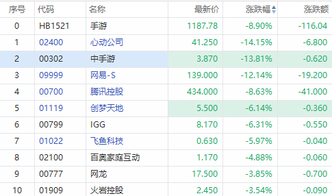 华盛资讯8月3日消息,游戏板块全线承压下行,截至发稿,心动公司跌超14%,中手游跌超13%,网易跌超12%,腾讯跌超8%,创梦天地、IGG跌超6%。