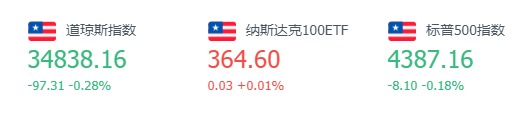 道指跌97.31点,或0.28%,报34838.16点;纳指涨8.39点,或0.06%,报14681.07点;标普500指数跌8.10点,或0.18%,报4387.16点。