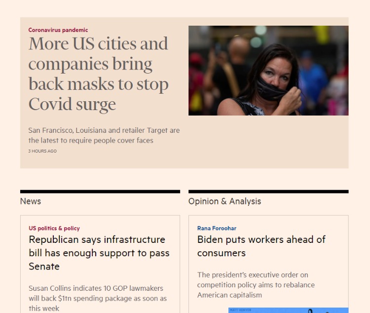 美国部分城市和公司已重拾口罩令,要求即使是已经完全接种疫苗的人也要戴口罩。拜登政府首席医疗顾问福奇称,美国不会重新封锁,但由于变异病毒导致新增病例大幅上升,情况将不容乐观。福奇和其他高级医疗官员敦促美国人都要佩戴口罩,并加速接种疫苗。