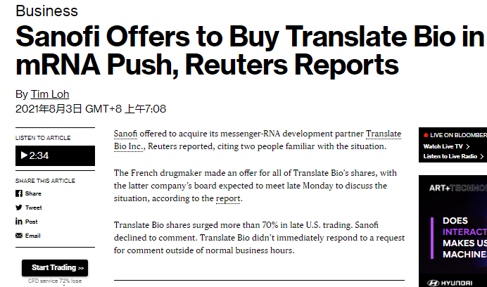 路透社援引两位知情人士报道称,赛诺菲(SNY)提议收购其mRNA研发合作伙伴Translate Bio Inc(TBIO),知情人士表示后者公司董事会料将于周一晚间开会讨论这一事宜。Translate Bio的股价在盘后飙升逾70%。赛诺菲对此不予置评。