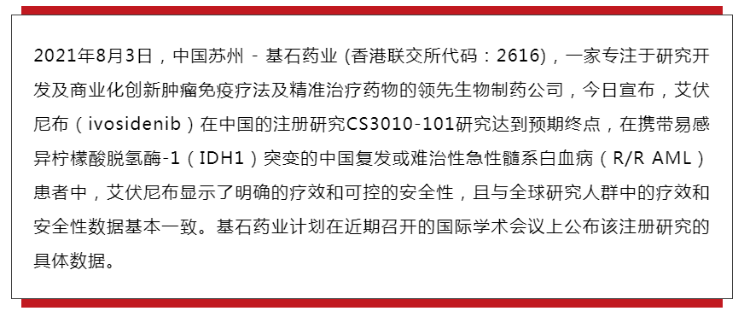 基石药业今日宣布,艾伏尼布(ivosidenib)在中国复发或难治性急性髓系白血病患者的注册研究达预期,新药上市申请已获中国国家药品监督管理局受理并拟纳入优先审评。