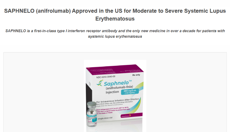 8月2日,阿斯利康宣布Saphnelo(anifrolumab-fnia)已在美国获批,用于正在接受标准疗法的中度至重度系统性红斑狼疮(SLE)成人患者的治疗。这标志着I型干扰素(I型IFN)受体拮抗剂首次获得监管批准。I型IFN在狼疮的病理生理学中起核心作用,I型IFN信号转导增加与疾病活动和严重程度增加相关。