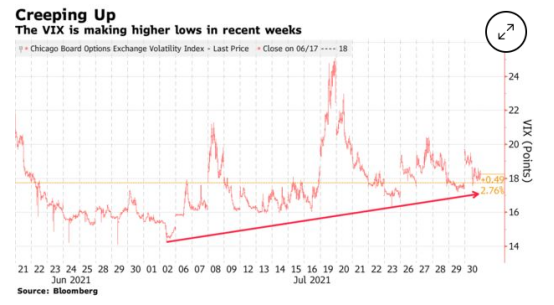 VIX指数(恐慌指数)近几周连续下跌至谷底,Tallbacken Capital Advisors LLC首席执行官Michael Purves表示,这种情况应该引起投资者的担忧。这是他看到的两个“黄色警示灯”其中之一,第二个是高收益债券利差变得相对稳定。