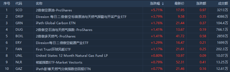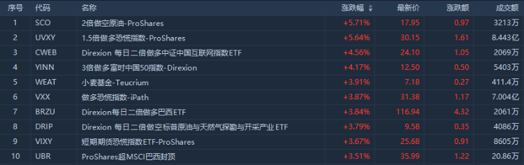 从ETF涨幅榜来看,涨幅居前的是2倍做空原油 $SCO ETF,收涨5.71%,成交3213万美元;每日二倍做空标普原油与天然气勘探与开采产业ETF $DRIP 涨3.79%,成交4086万美元。