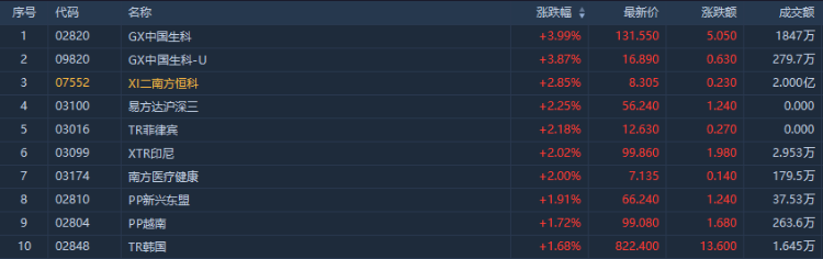 GX中国生科ETF $02820.HK 收涨3.99%,成交1847万港元;南方医疗健康ETF $03174.HK 收涨2%,成交179.5万港元。