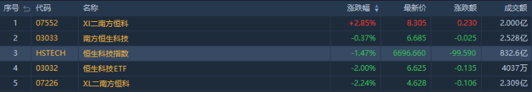 南方两倍做空恒科 $07552.HK 涨2.85%,成交额2.00亿港元。