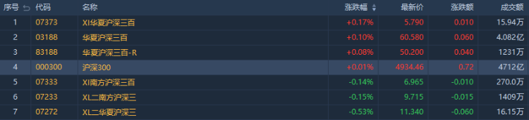 沪深300指数收涨0.01%。其中,华夏沪深三百ETF $03188.HK 涨0.1%,成交额约4.082亿港元;华夏沪深三百-R $83188.HK 涨0.08%,成交额达1231万港元。