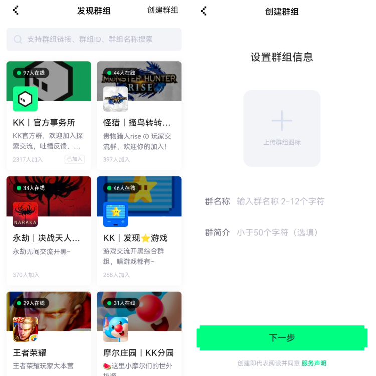 同时,NokNok也支持用户主动创建群组。可创建的群组类型有4种,分别为“游戏模板”,适合重度游戏爱好者,讨论游戏心得;“公会模板”,公会玩家的专属基地,便于游戏之间的交流;此外还有“KOL模板”,是个建造用户的私人营地,与粉丝面对面交流;最后则是“空白模板”,可以自定义群组类型。