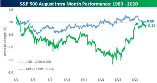 Bespoke Investment Group研究人员对表现不佳的8月份进行了更细致的分析,尤其是经历了今年迄今的强劲表现之后。