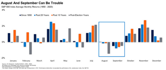 LPL Financial首席市场策略师Ryan Detrick 在周一的研究报告中写道:“从历史上看,8月和9月是一年中最疲弱的两个月。”