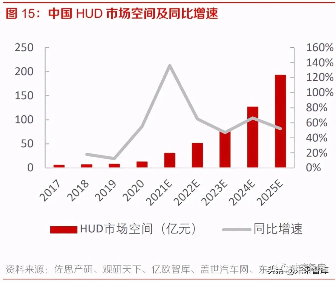 对于 HUD 的渗透率,当前行业整体渗透率不足 5%,根据亿欧智库,2021 年 HUD 渗透率将提升 至 10%左右,至 2025 年将提升至 30%左右;根据盖世汽车,2025 年 HUD 渗透率将提升至 40% 以上。HUD 能够使行车过程更加安全,当前越来越多车型开始搭载 HUD 产品,随着消费者的接 受度提升,预计 2021 年后 HUD 行业渗透率将快速提升。