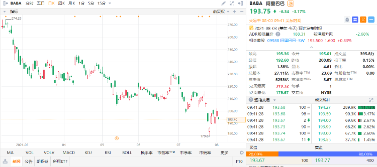 截至发稿,阿里巴巴跌3.17%,报193.75美元,总市值为5253亿美元。