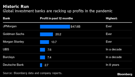 别管什么银行家已经疲惫不堪,为了返回办公室而烦恼和新一波疫情了。对全球最大投资银行来说,一个简单而突出的事实是他们正创造前所未有的利润。
