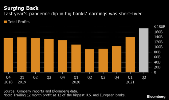 财报季尘埃落定,十几家最大银行过去四个季度的利润总和超过1700亿美元,彰显出该行业与疫情早期的低迷相比发生了多么巨大的变化。摩根大通尤为出色,所获利润相当于每天赚进1.31亿美元。