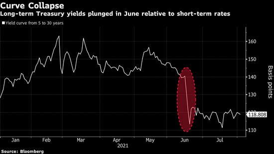 美国5年-30年期国债收益率曲线在6月份曾出现三天趋平超过25个基点的走势,为2020年3月以来最大跌幅,上述利差到月底也几乎没有扩大。知情人士说,Alphadyne大量押注收益率曲线趋陡,并且反应迟缓。
