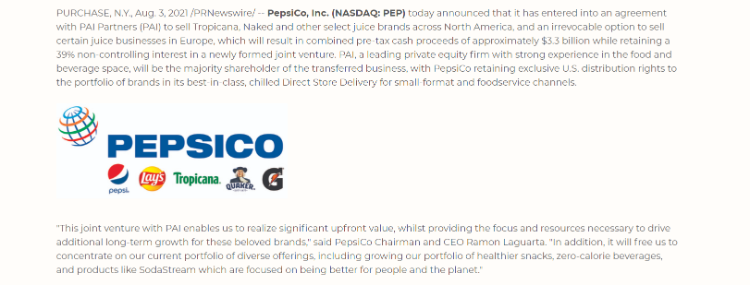 食品饮料巨头百事公司(PepsiCo)发布公告称,公司已经同意向法国私募股权公司PAI出售包括纯果乐等北美地区的果汁品牌,以及出售相关品牌在欧洲业务的不可撤销收购权,合计将获得33亿美元的税前收入。