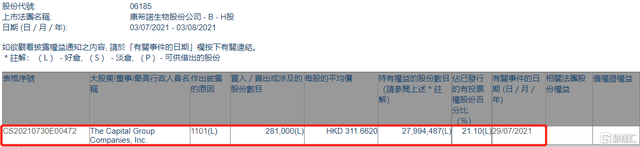 康希诺生物-B(06185.HK)获美国资本集团增持28.1万股