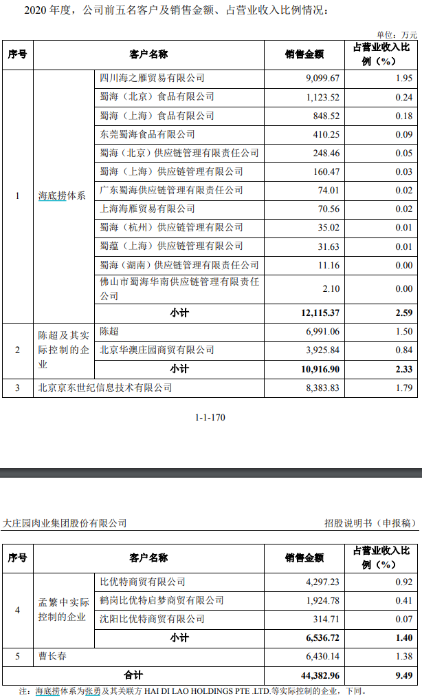 根据大庄园集团2020年前五大客户名单,海底捞体系相关企业为公司2020年第一大客户,当年销售金额为1.21亿元,占公司营业收入比例2.59%;京东为公司第三大客户,当年销售金额为8,383.83万元,占公司营收比例为1.79%。